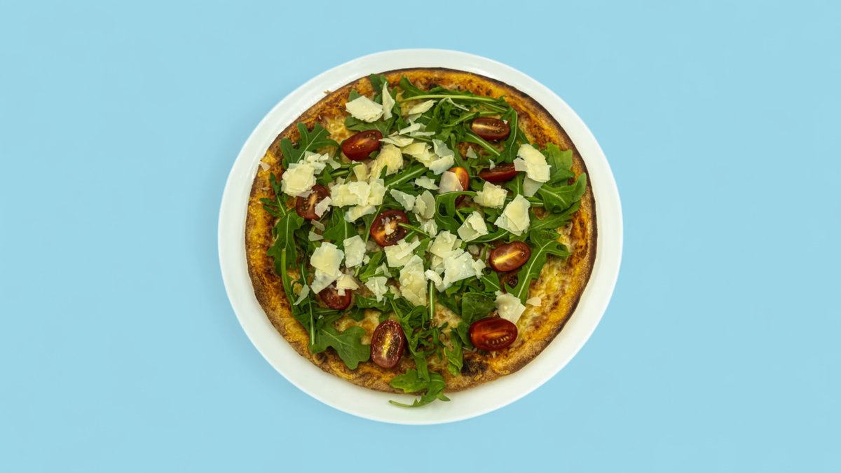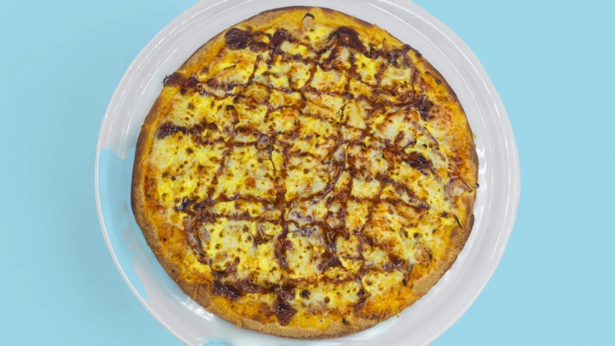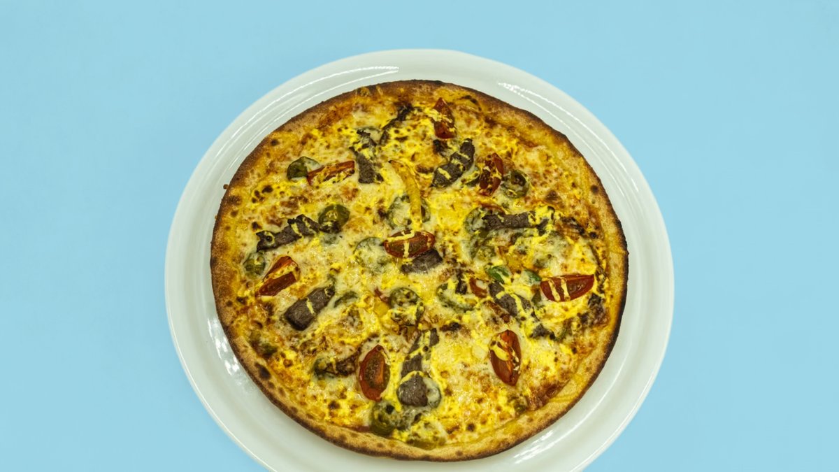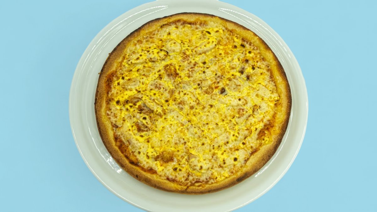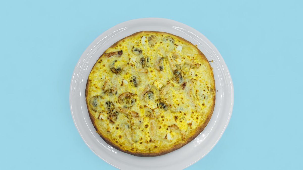 mit veganem Hähnchen, Peperoni, Mais, Paprika, veganem Pizzastreu und veganem Sauce hollandaise