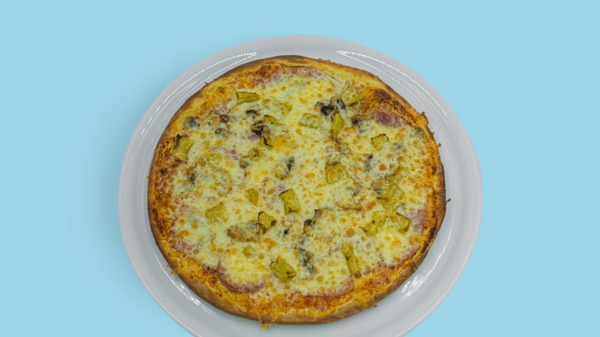 alle Pizzen werden mit würziger Pizzasoße und Gouda zubereitet, und in einer Größe deiner Wahl serviert („Vegane Pizza Margherita“ wird ohne Gouda zubereitet)