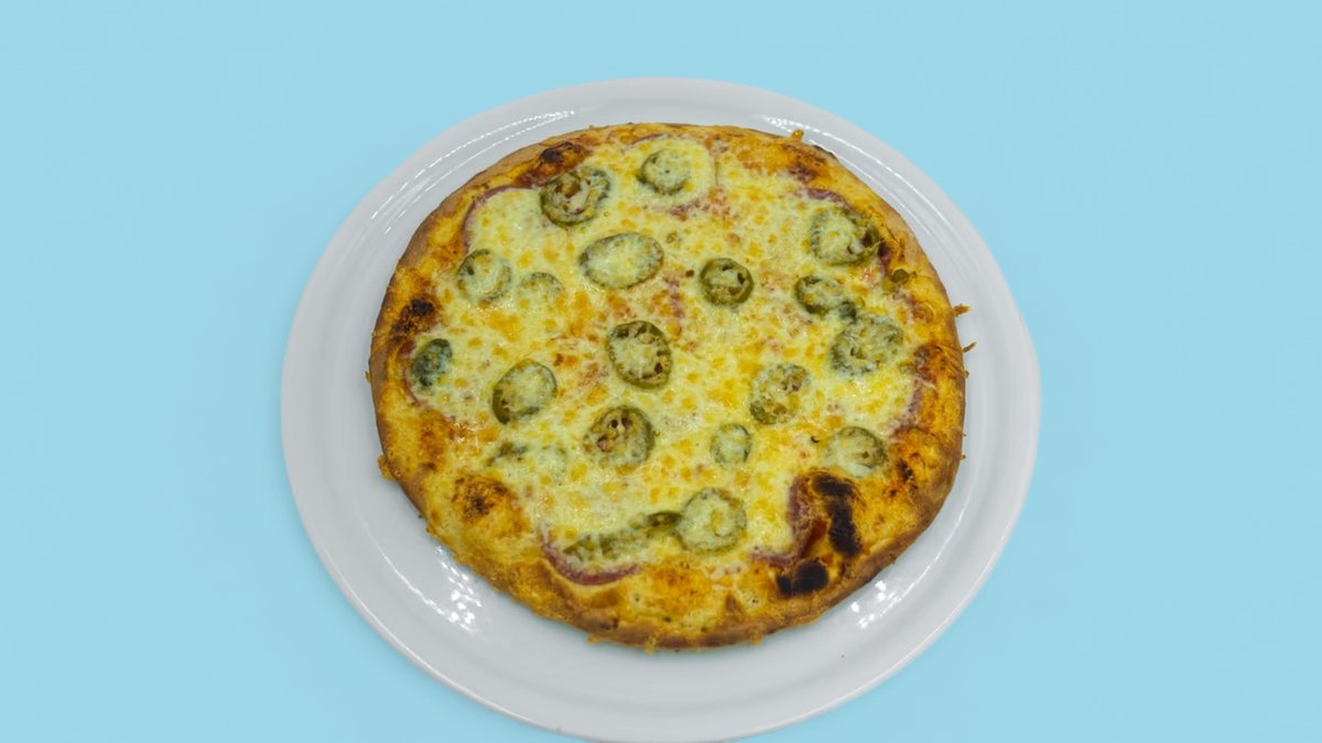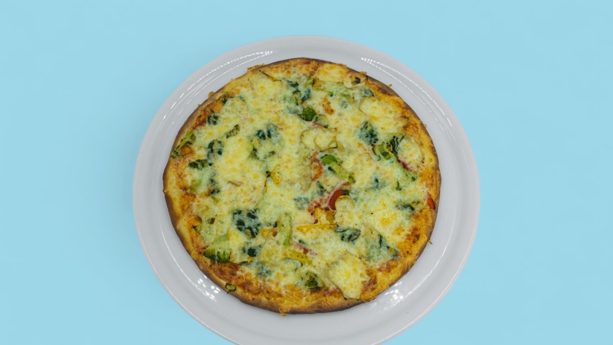mit Oliven, Paprika, Brokkoli, Jalapeños und veganem Pizzastreu