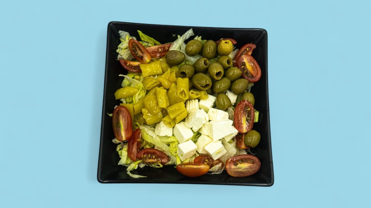 mit Oliven, Kirschtomaten, Hirtenkäse und Peperoni