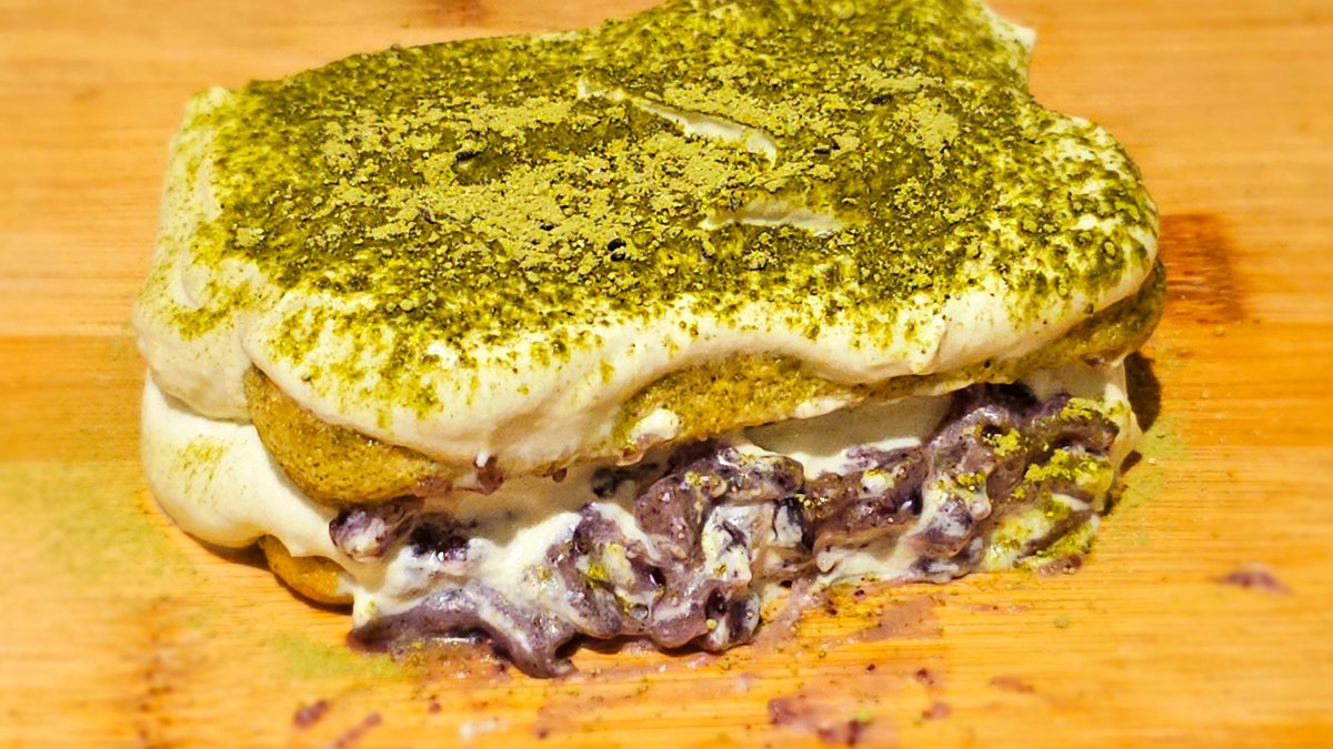 Ein geschichtetes Vergnügen aus Matcha, Taro und lila Reis. Zart, köstlich und entworfen, um Sie zu verzaubern.
