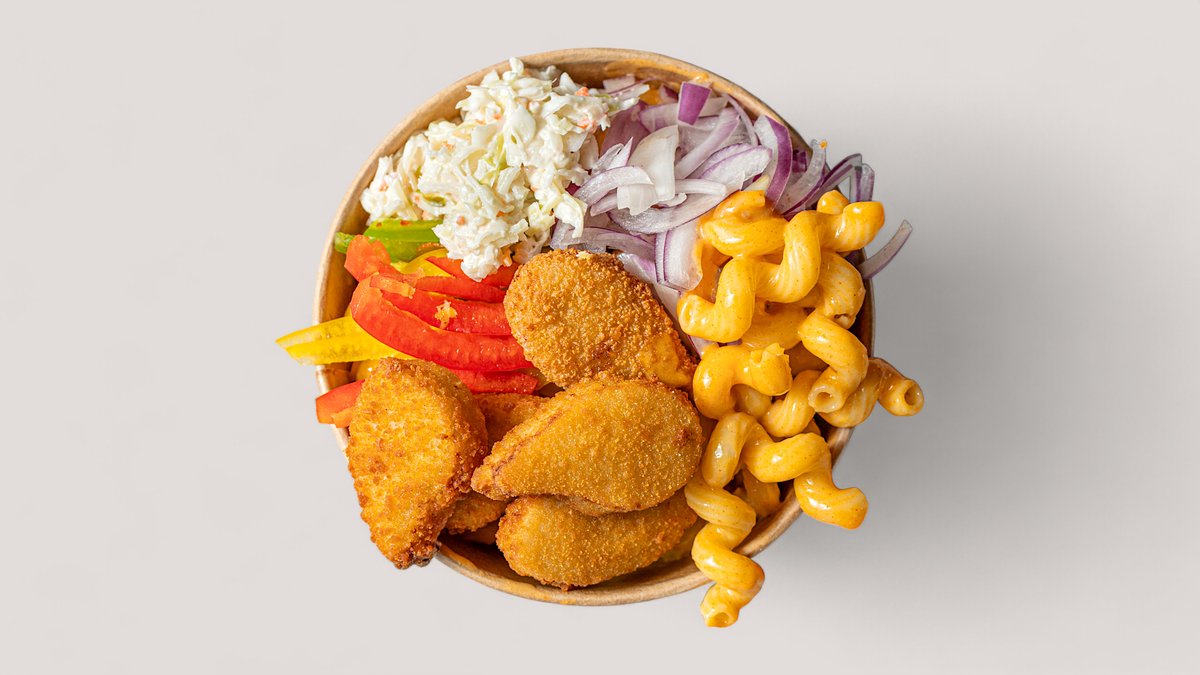 mit Crispy-Chicken Stripes, Krautsalat, GewĂĽrzgurken und Mais