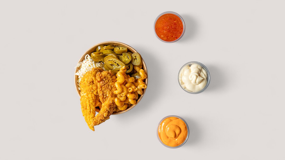 mit Crispy-Chicken Stripes, Jalapeños, Krautsalat und Takis