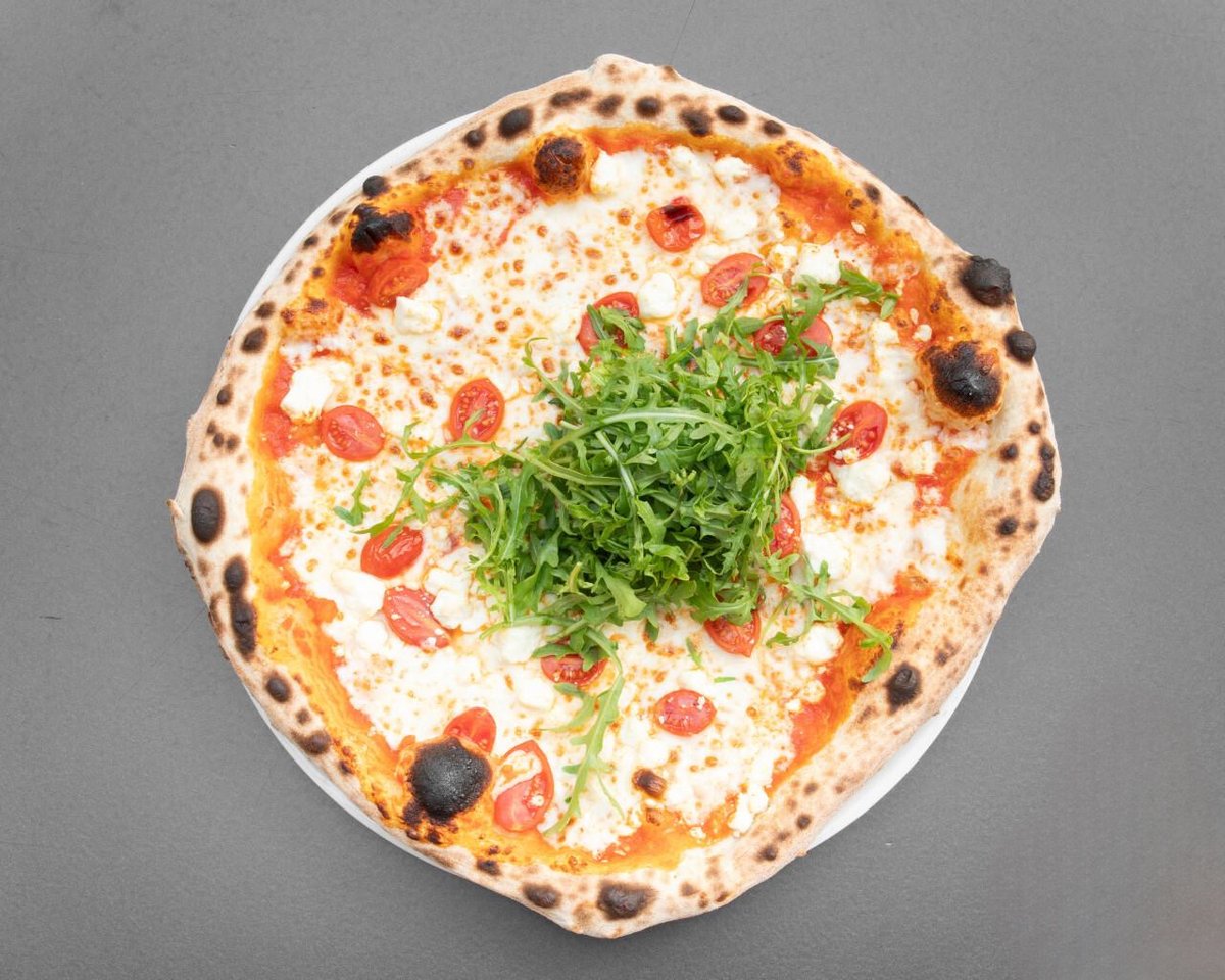 mit Rucola, Kirschtomaten, Mozzarella di Bufala, Basilikum und Balsamico-Creme