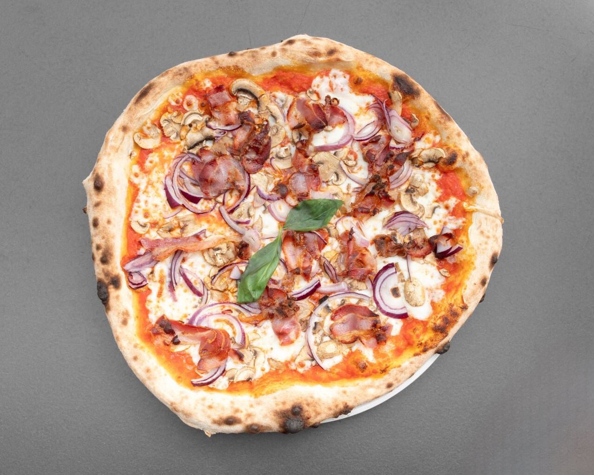 mit Speck vom Schwein, Champignons und roten Zwiebeln