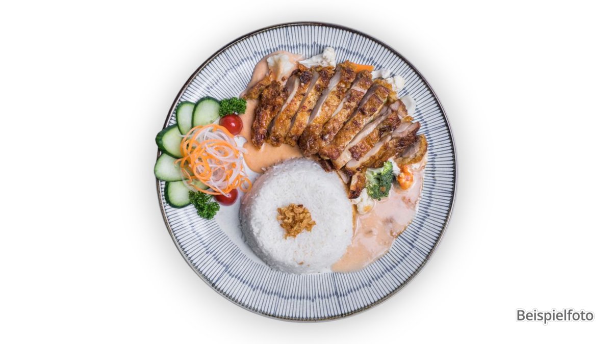 Reisbandnudeln mit buntem Salat, Röstzwiebeln, Gemüse in cremiger Erdnuss-Kokos-Currysoße, Koriander, Basilikum, Minze und einer Zutat deiner Wahl