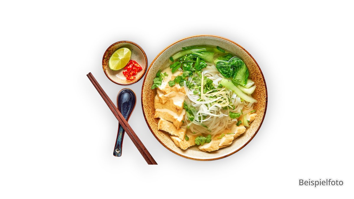 Reisbandnudelsuppe mit Hähnchenfleisch, Frühlingszwiebeln und Koriander