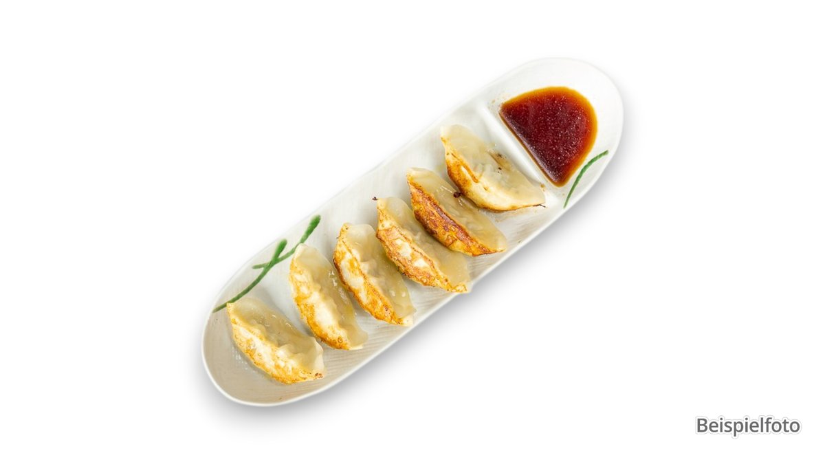 jede Portion enthält 8 Stück und wird in einem dünnen knusprigen Teig mit verschiedenen Füllungen, Sesam und Teriyaki-Soße zubereitet