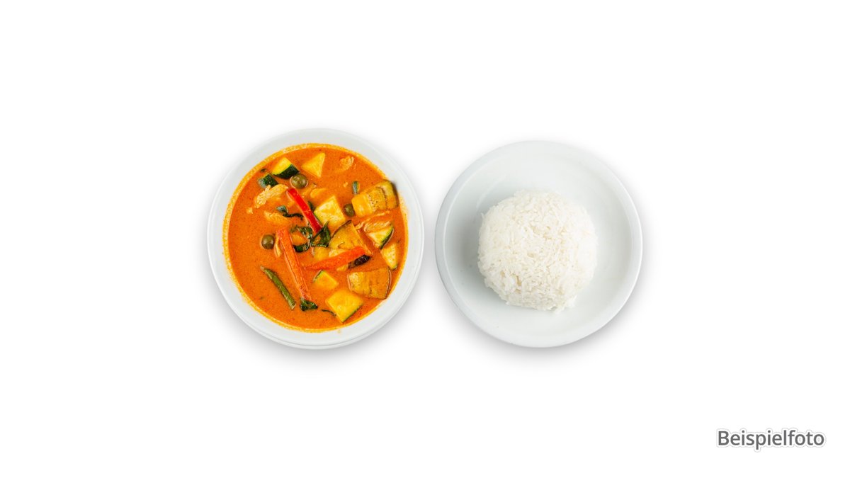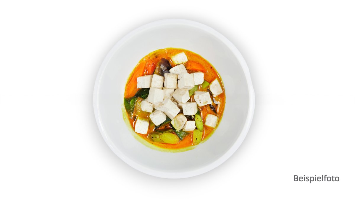 leicht scharf mit Kokosmilchsauce, gebackenem Tofu, Champignons, Bambus, Zwiebeln und Koriander