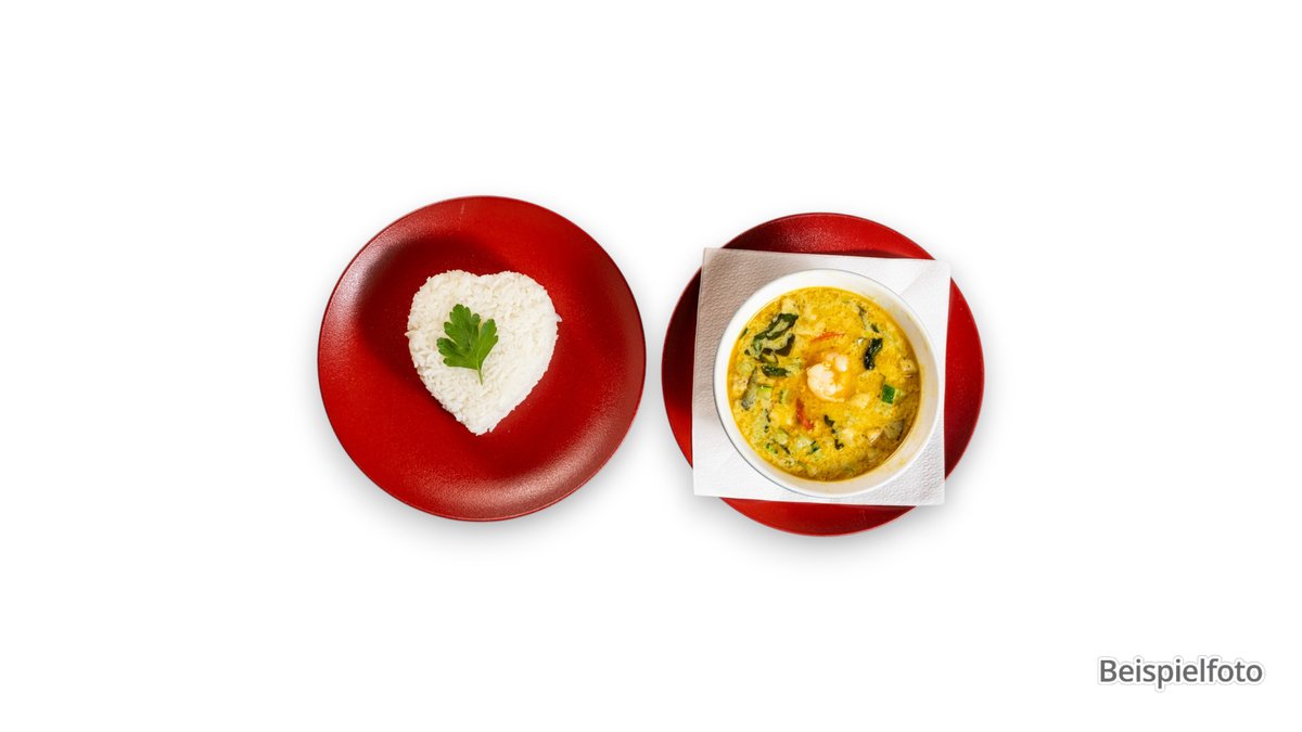 leicht scharf mit Kokosmilchsauce, Garnelen, Champignons, Bambus, Zwiebeln und Koriander