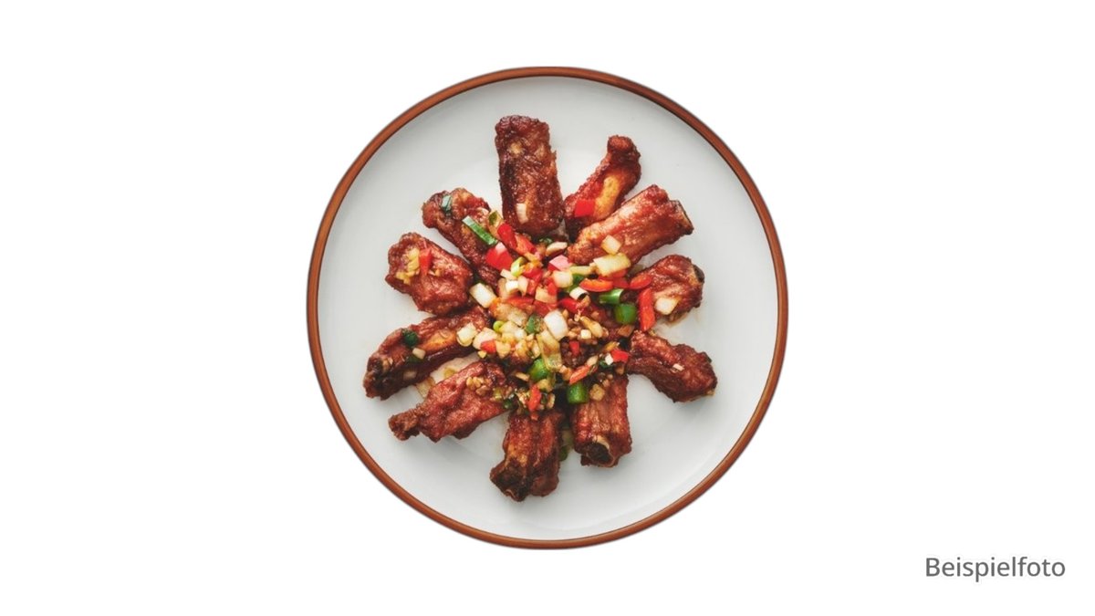 Schweinerippchen mit Kartoffelspalten, Krautsalat, Barbecuesoße und Schmand