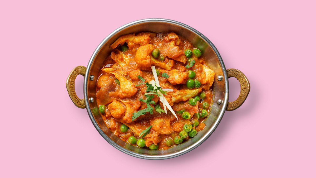 Blumenkohl und Erbsen gebraten mit Kümmel und Zwiebeln