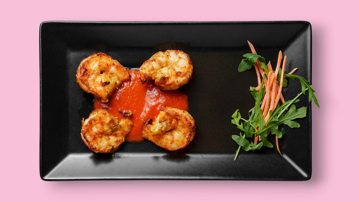 gebratene Scampi in Knoblauch-Joghurt-Tomatensoße
