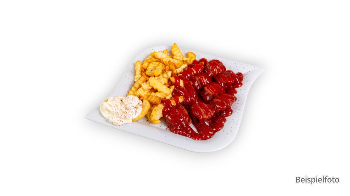 mit Pommes frites und Curry-Ketchup
