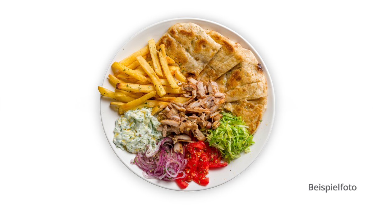 mit Gyrosfleisch, Zwiebeln, Pommes frites, Tsatsiki und Krautsalat