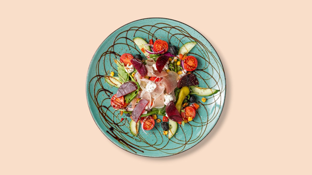 gemischter Salat mit Parmaschinken, Rote Bete, Ziegenkäse und Balsamico-Creme