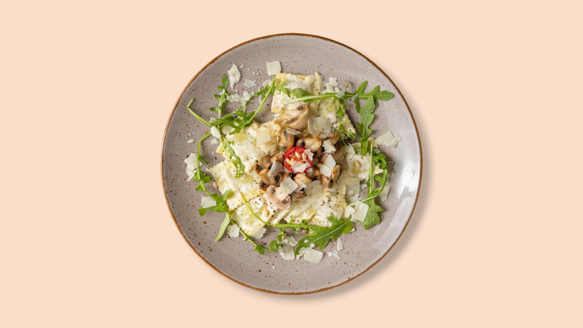 mit Spinatfüllung, Butter, Champignons, Trüffel-Parmesansoße, Rucola und Pinienkerne