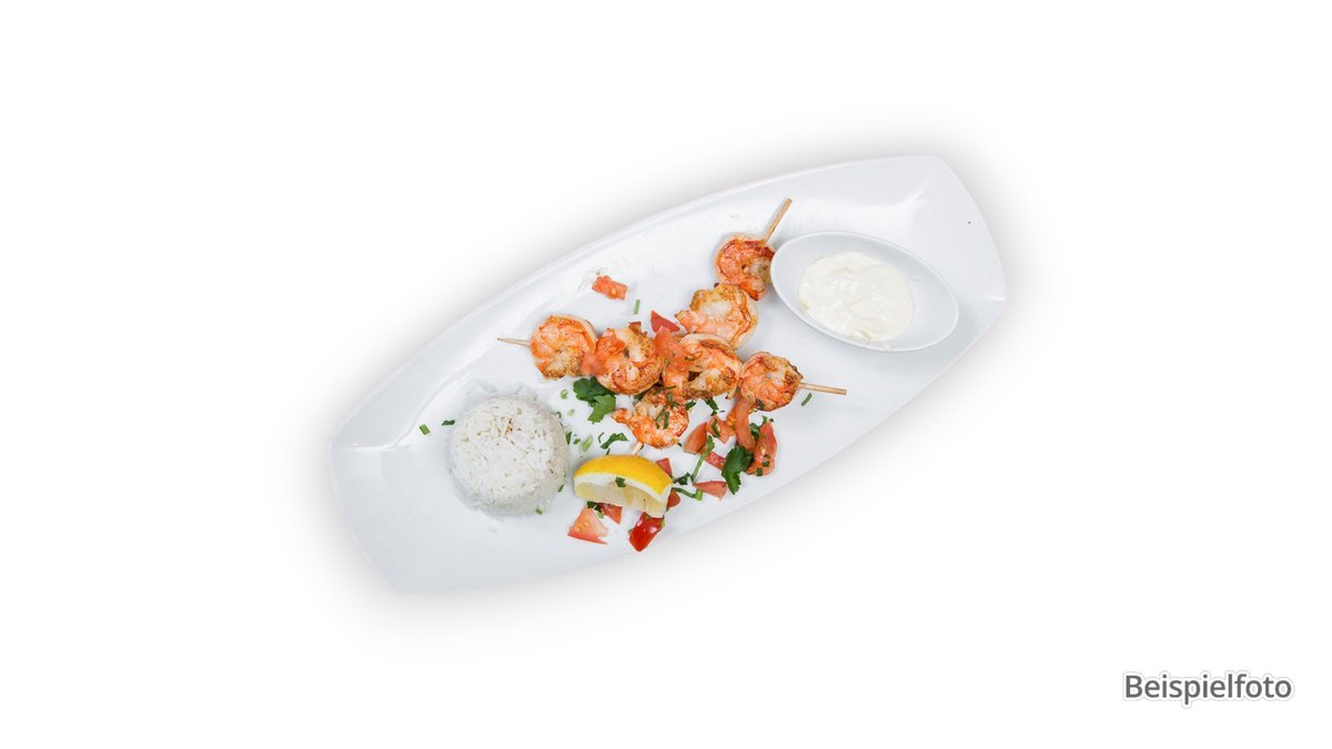 mit 5 Garnelen in Joghurt-Safran-Soße mariniert, aus dem Lehmofen mit Knoblauch, Ingwer und Salat