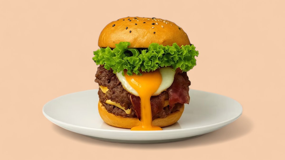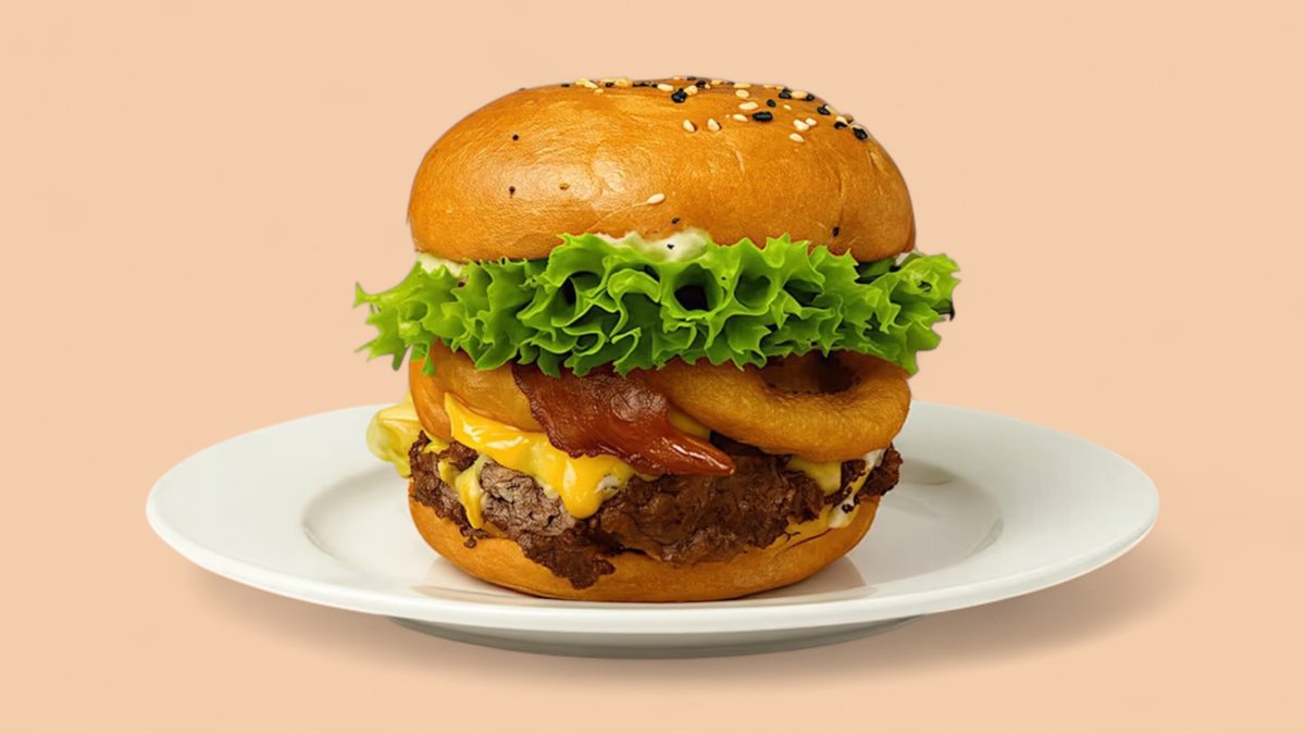 mit Rindfleischpatty, Barbecuesoße, Kräuterbutter, Eisbergsalat, zerhackten Zwiebeln, Zwiebelringen, Speck vom Rind und Ei
