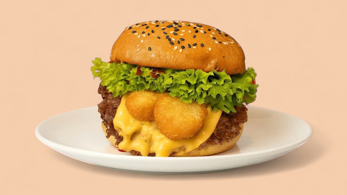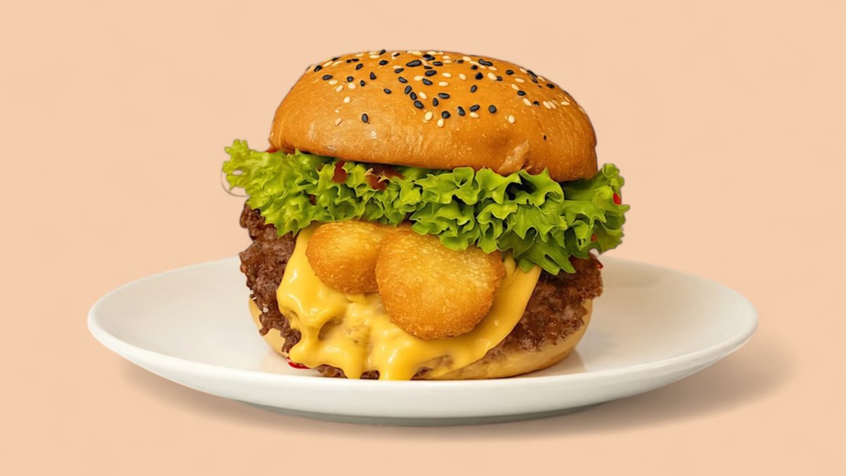 mit Rindfleischpatty, Sriracha, Joppie, Eisbergsalat, karamellisierten Zwiebeln, Chilli Cheese Nuggets und amerikanischem Cheddar