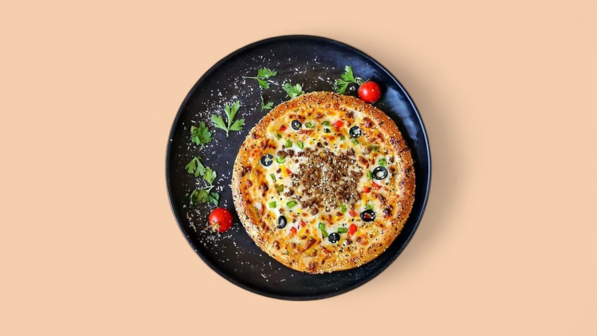 mit Mix aus Hähnchen- und Rinderschinken, Hackfleisch vom Rind, Mais und Oliven