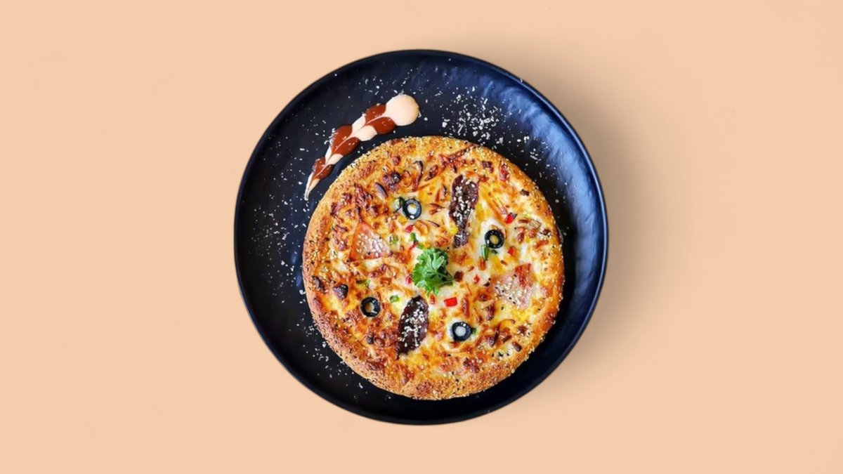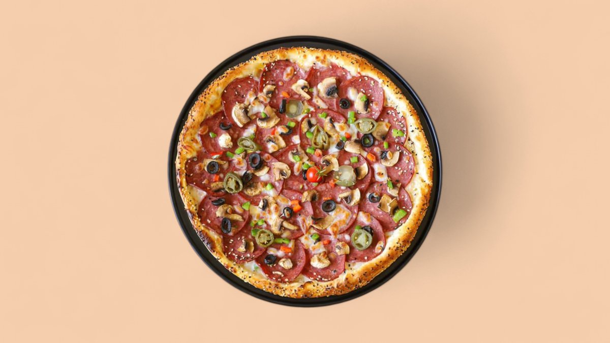mit Mix aus Hähnchen- und Rinderschinken, Hackfleisch vom Rind, Peperoni-Salami vom Rind, gegrilltem Hähnchen, Mais und Oliven