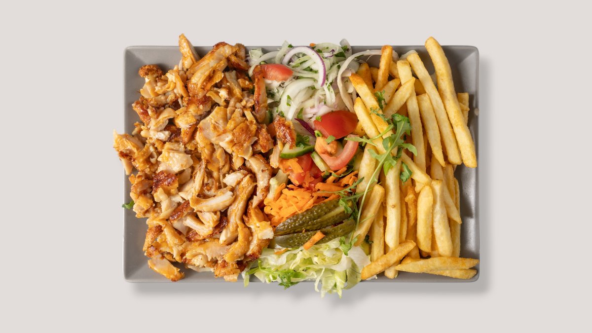 mit Pommes frites, DrehspieĂźfleisch deiner Wahl und Falafel