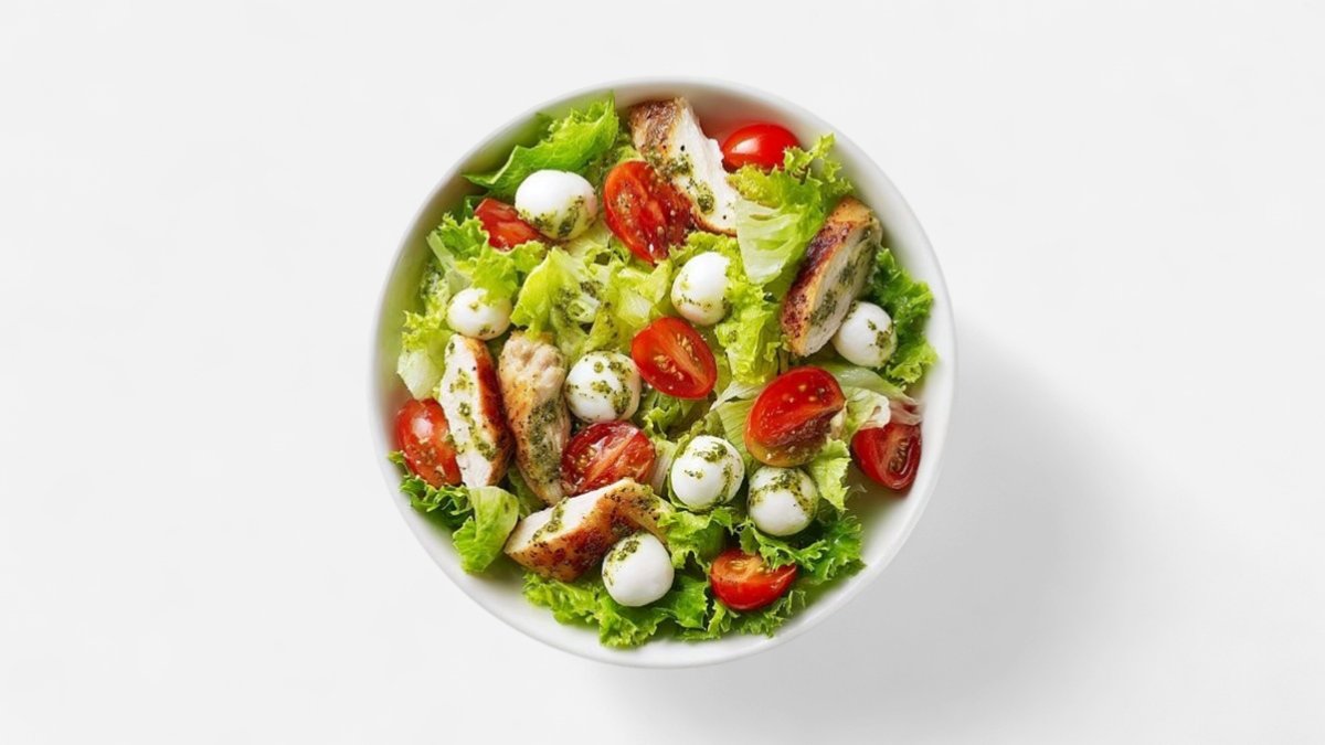 mild Hähnchenbrust mit Zwiebeln, milden Peperoni, Tomaten, Salatgurken und Eisbergsalat