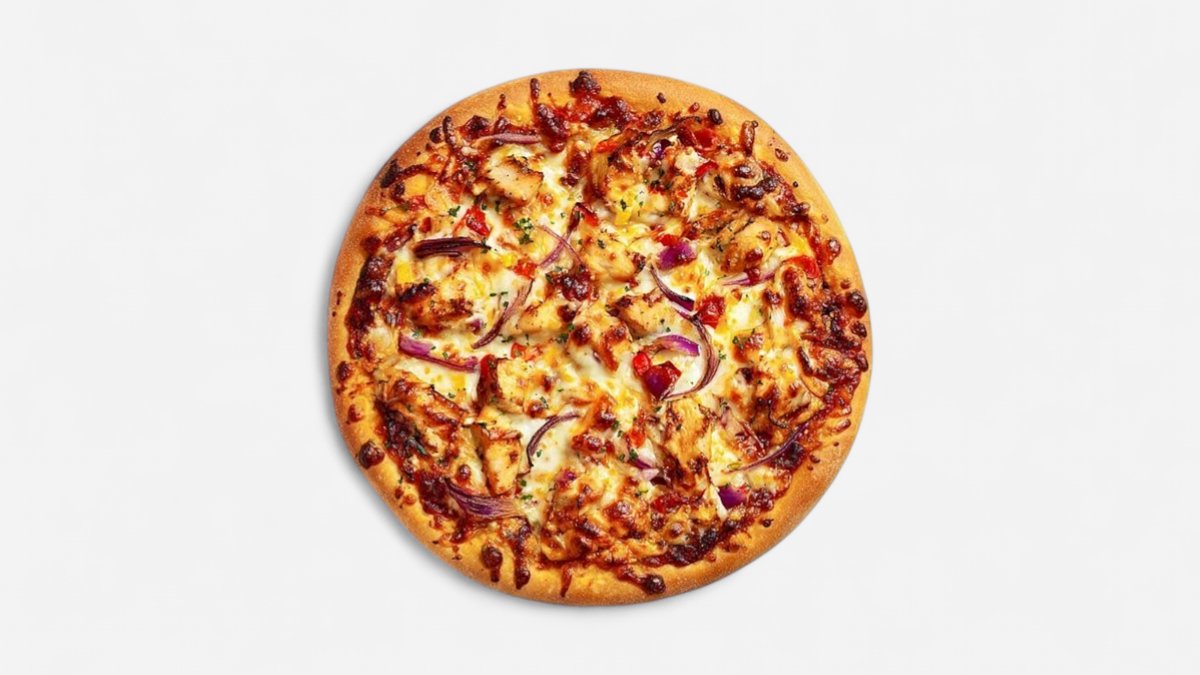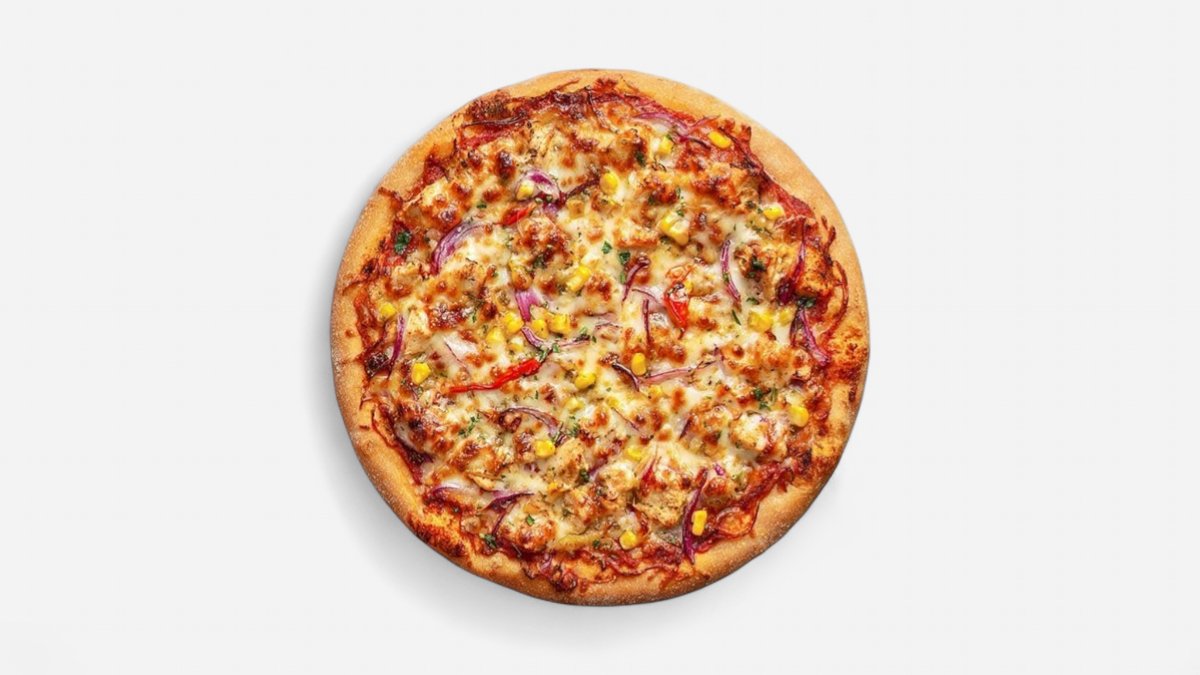 mit Hähnchenbrust, Zwiebeln, Jalapeños, Mais, Paprika, Barbecuesoße, Sauce hollandaise und Chilisoße