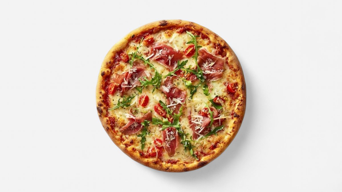 mit würziger Pizzasoße, Serrano Schinken, Rucola, sonnengereiften Tomaten, Grana Padano und Gouda