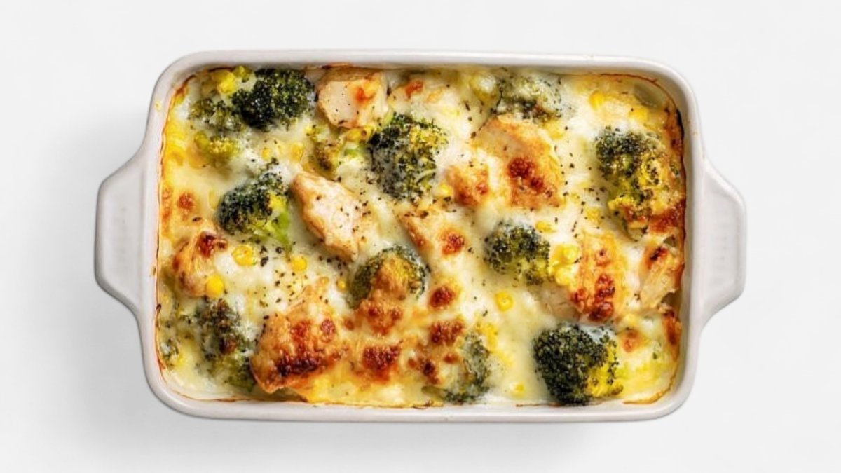mit feiner Sauce hollandaise, zarter Hähnchenbrust, Mais, Brokkoli und Gouda