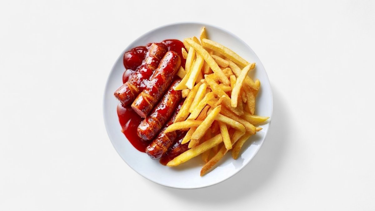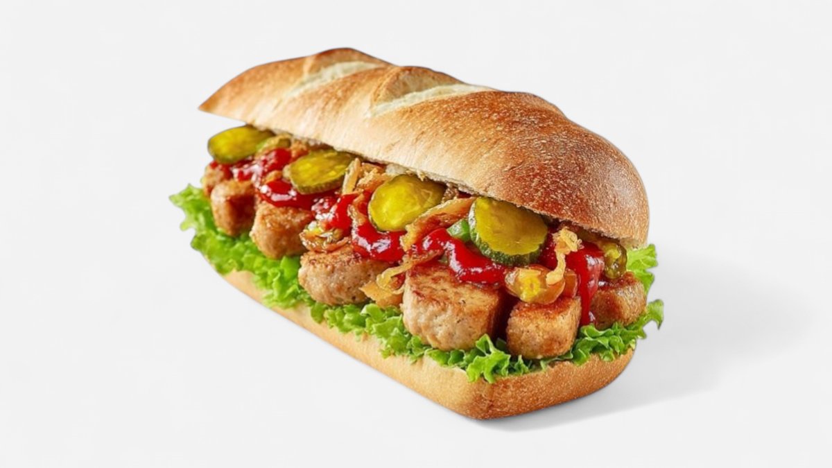 mit Geflügelwürsten, Ketchup, Gewürzgurken, Röstzwiebeln und Eisbergsalat