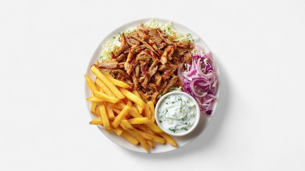 alle Hauptgerichte werden mit Gyros-Spieß, Zwiebeln und einer Beilage deiner Wahl serviert