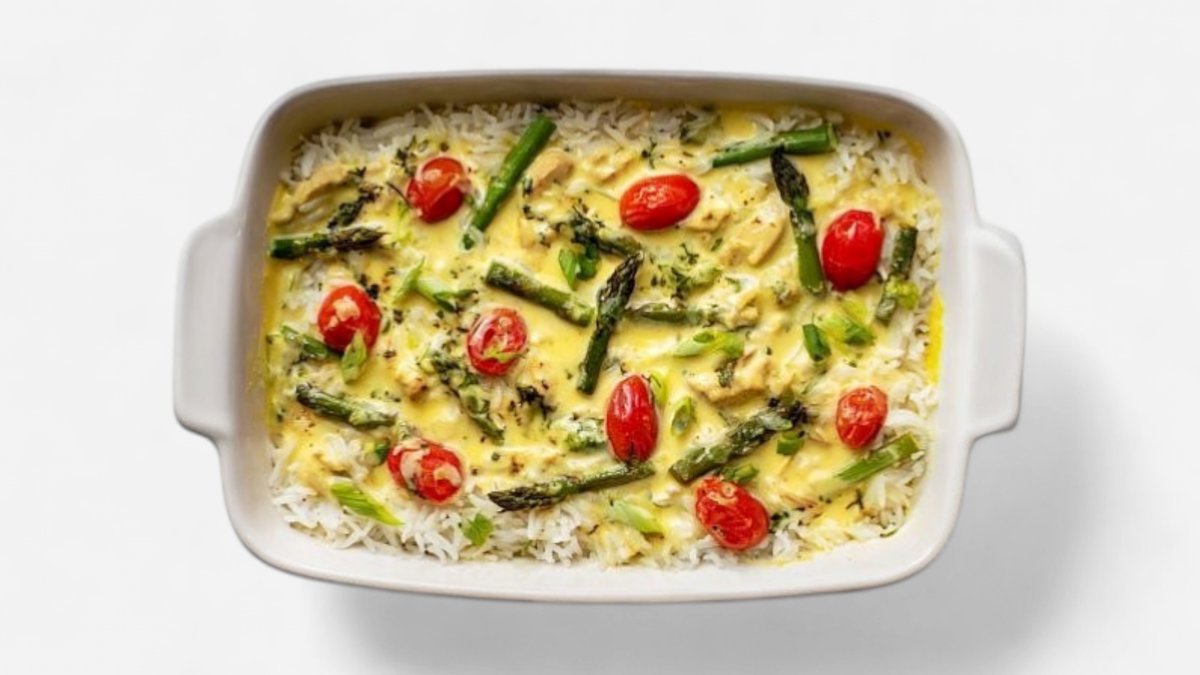 mit grünem Spargel, Frühlingszwiebeln, Kirschtomaten, Basilikumpesto, veganer Sauce hollandaise und veganem Hähnchen