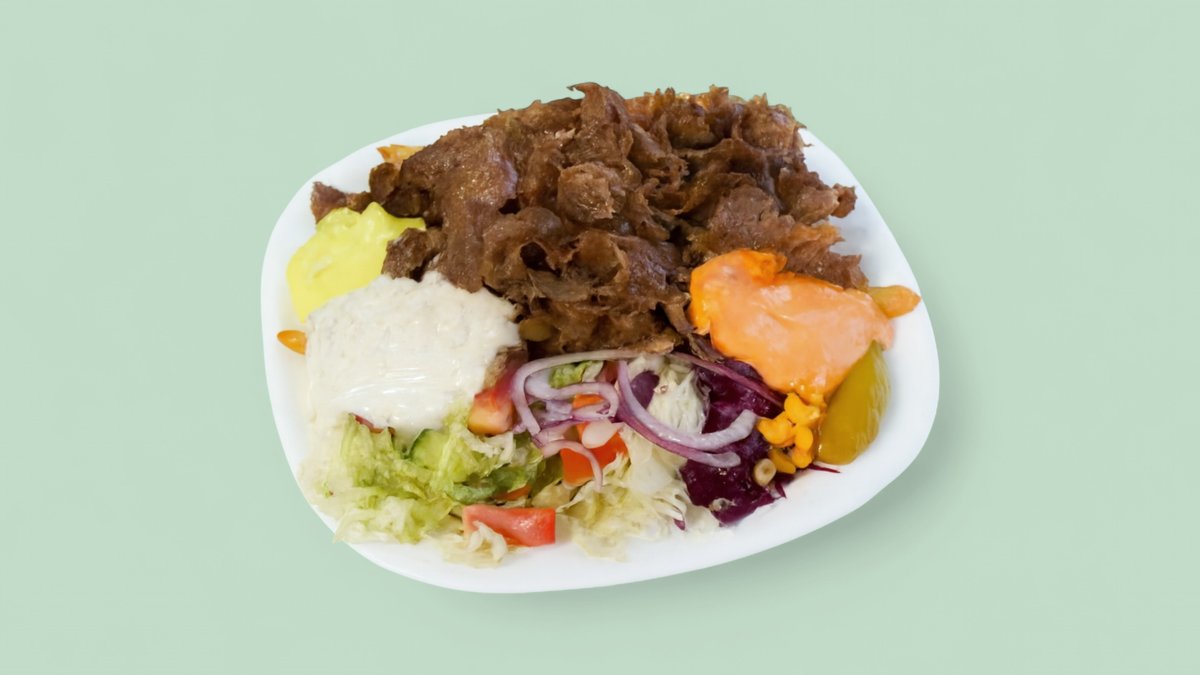 alle Gerichte werden mit Hackfleisch-Drehspieß aus Rind und Hähnchen zubereitet und mit Salat und Soße serviert („32. Dönerteller” und „36. Veggie Dürüm” werden ohne Soße serviert, „37. Döner Box” wird ohne Salat serviert)