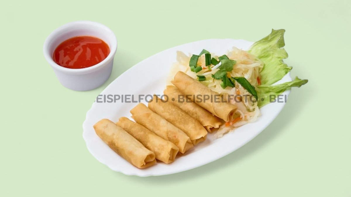 mit gebratenen Nudeln oder Reis mit paniertem Hühnerfleisch, Mini-Frühlingsrollen, Gemüse und Soße deiner Wahl