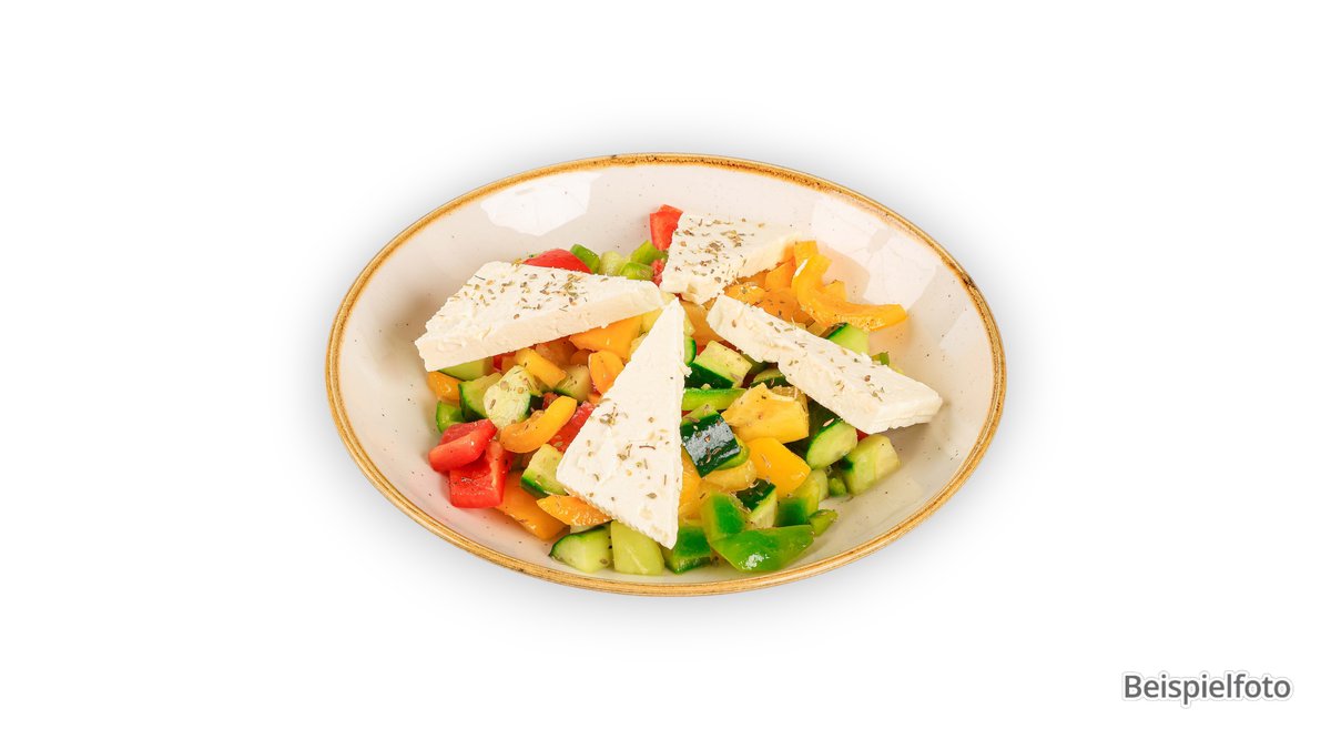 mit Auberginen, Paprika, Zucchini, Pilzen, Tomaten, Gurken, Rucola, Mozzarella und Joghurtsoße