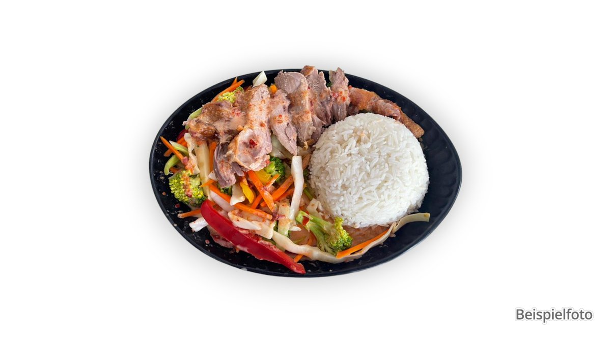 mit Wokgemüse, Jasminreis und Erdnusssoße
