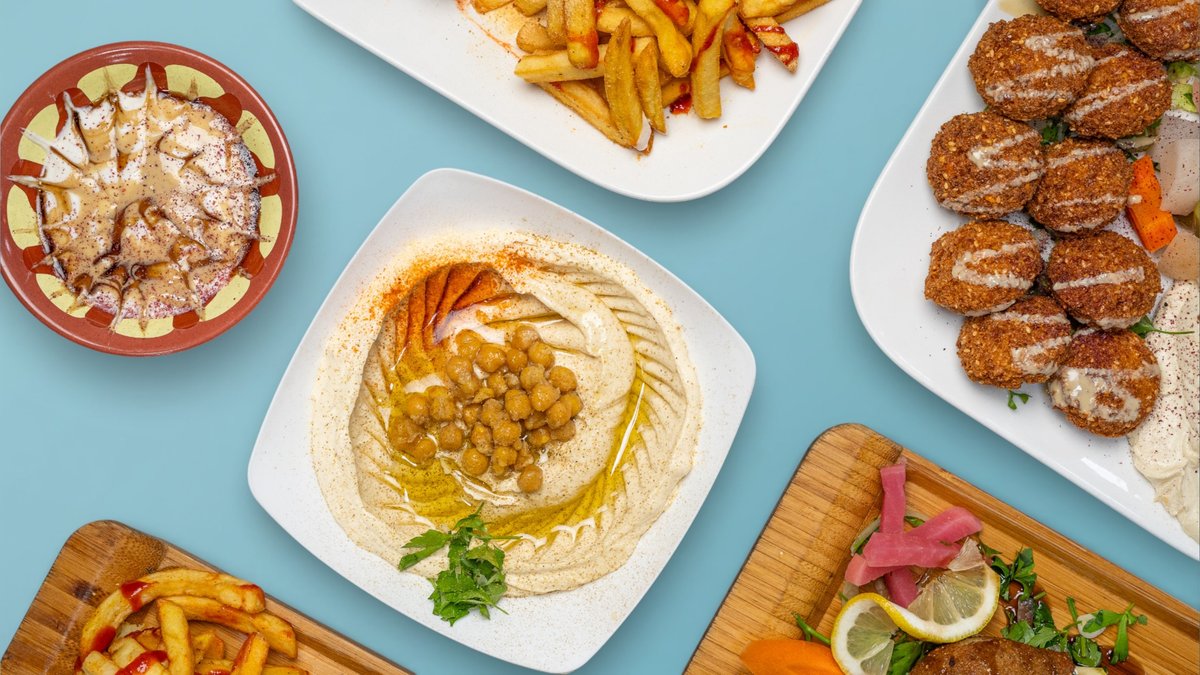 Ein Geschmack des Nahen Ostens mit klassischen Favoriten: Hummus, Falafel, Shawarma und herzhafte Bohnen