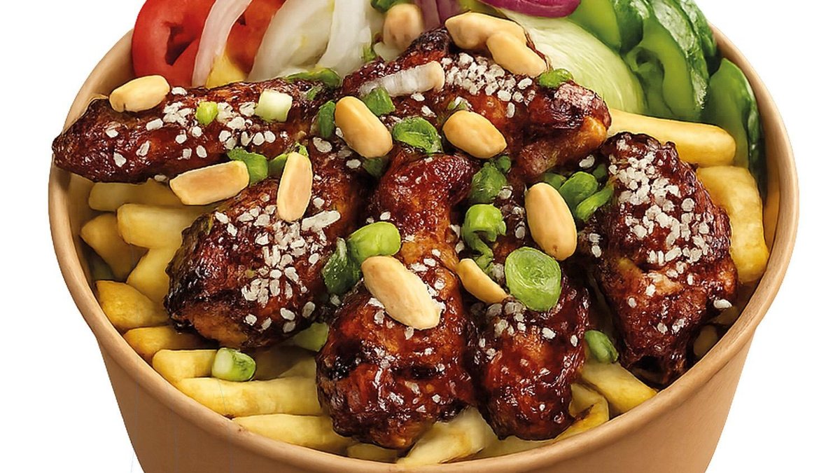 Eine leckere Bowl mit Saftigen Chicken-Wings in Teriyaki Sauce, Frischem Salat, Tomaten, Gurke, Mais, Ziwebeln; dazu knusprige Pommes- verfeinert mit Frühlingszwiebeln, Sesam und Erdnüssen für Extra-Crunch und - Geschmack plus japanisches Goma-dressing