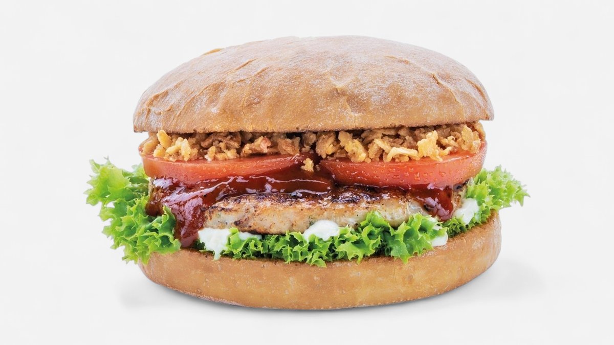 mit Hähnchen-Patty, Röstzwiebeln, Barbecuesoße und Burgerbrötchen