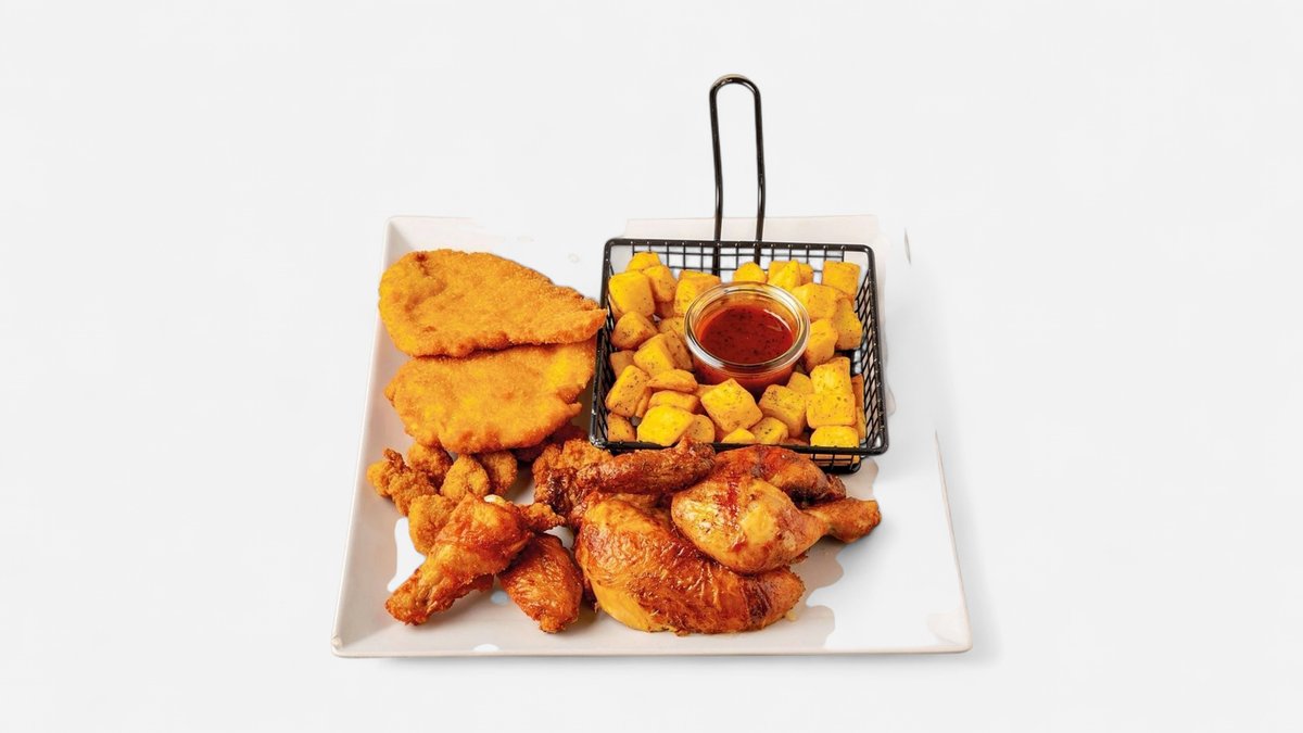 mit 1 halbes Grillhähnchen, 2x kleinen Schnitzel, 3x Barbecue Wings, 3x Knusper Wings, 3x Chicks, 3 FriedchickenStripes, 8x Zwiebelringe, 1 Pommes frites, 1 Kartoffelcubes und 4x Dips deiner Wahl