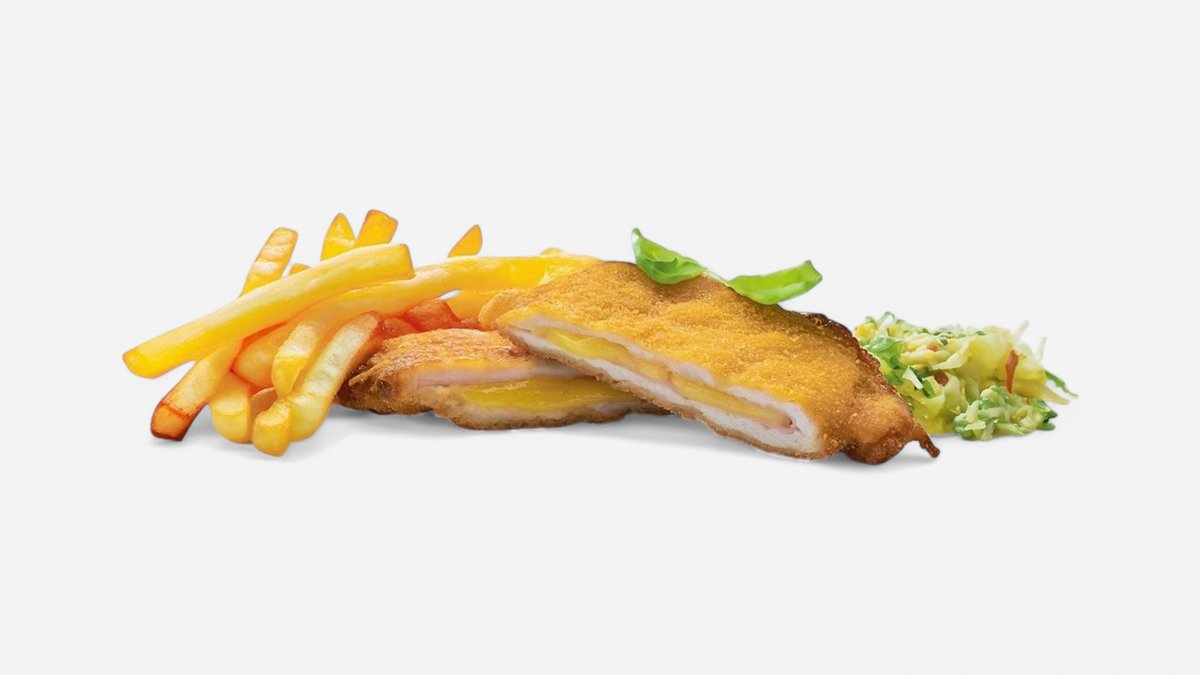 paniertes Schnitzel mit Käse, Geflügelschinken, Pommes frites und Beilagensalat