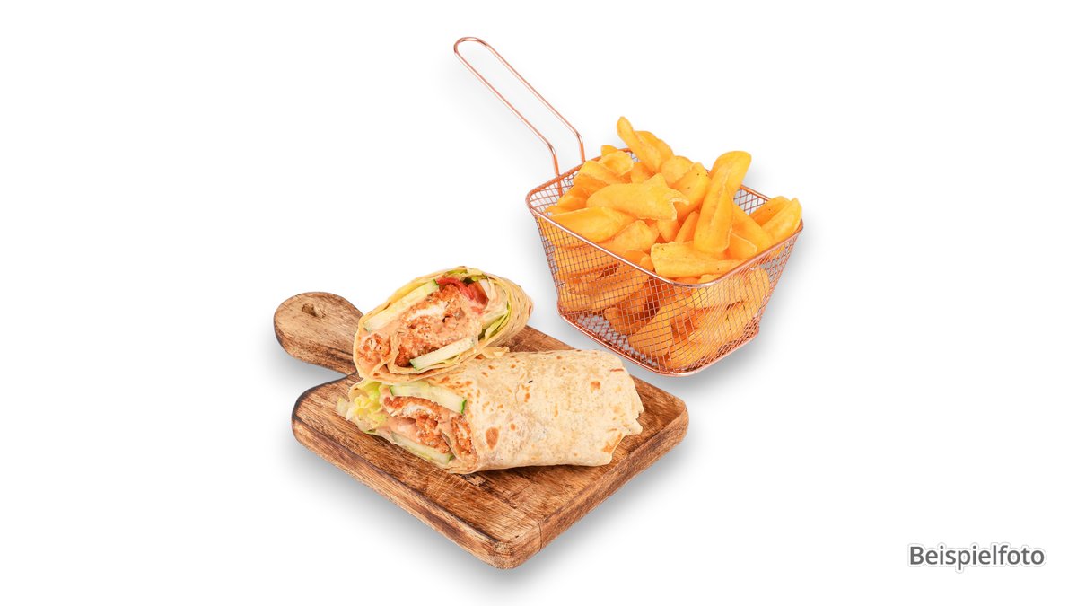 1x Drehspießfleisch im Yufka, 1x Pommes frites, 1x alkoholfreies Getränk 0,33 l deiner Wahl