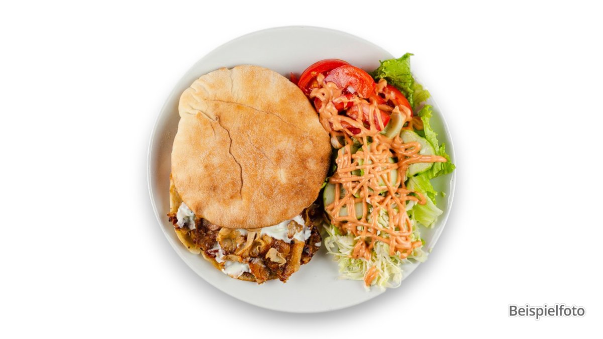 1x Drehspießfleisch im Fladenbrot, 1x Pommes frites, 1x alkoholfreies Getränk 0,33 l deiner Wahl