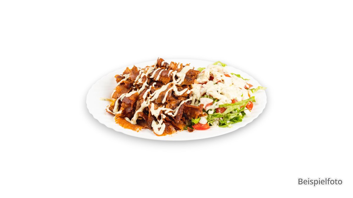 1x Drehspießfleisch-Teller mit Salat, 1x Beilage deiner Wahl, 1x alkoholfreies Getränk 0,33 l deiner Wahl
