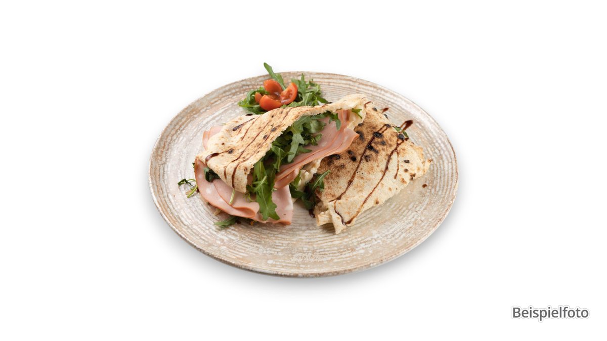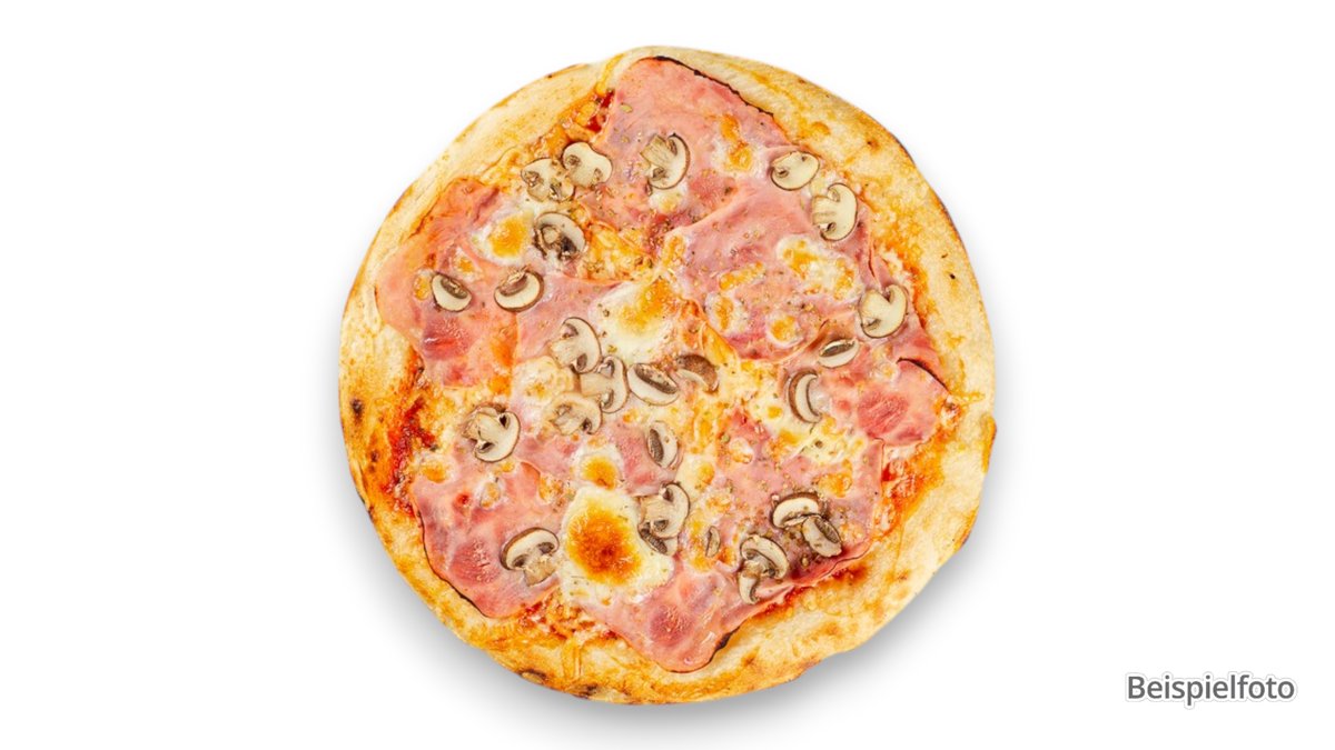 gefüllt mit Schinken von der Pute, Salami vom Rind, Pilzen und Pizzasoße