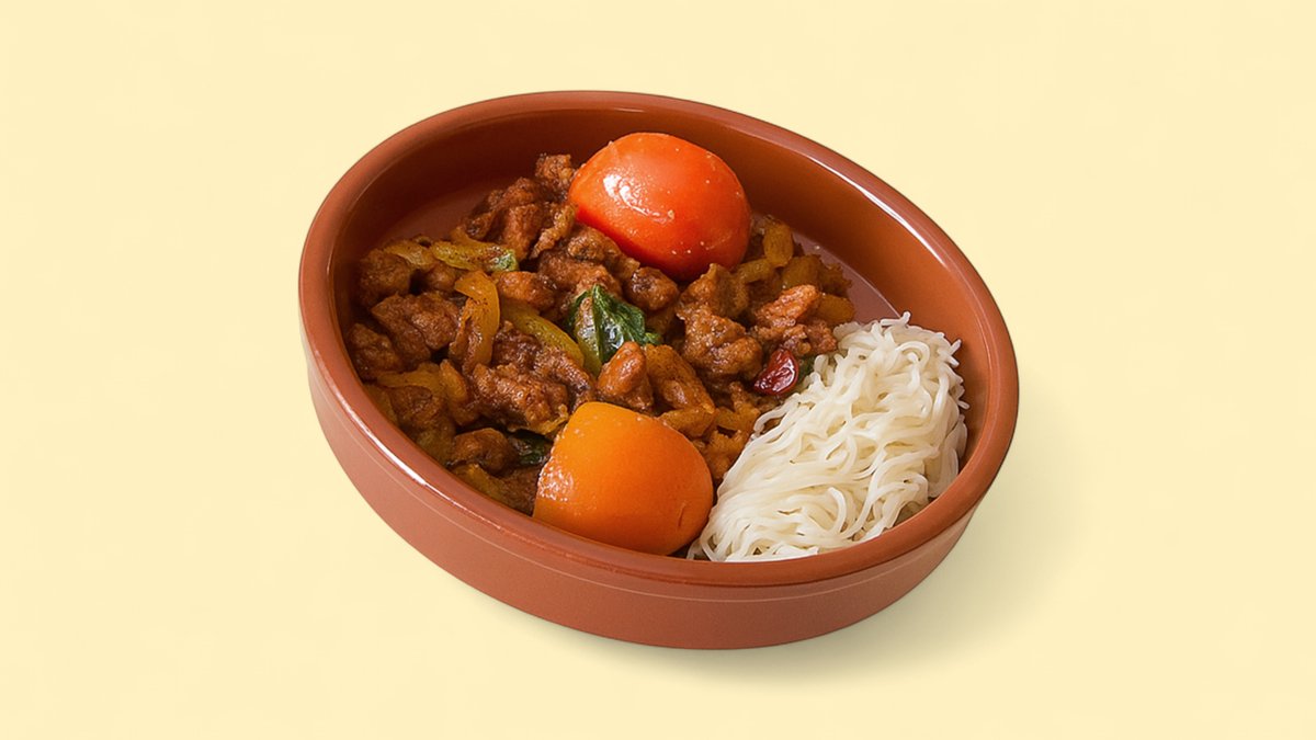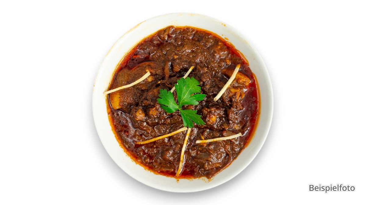 in würziger Soße mit traditionellen Gewürzen, Zwiebeln und Chili