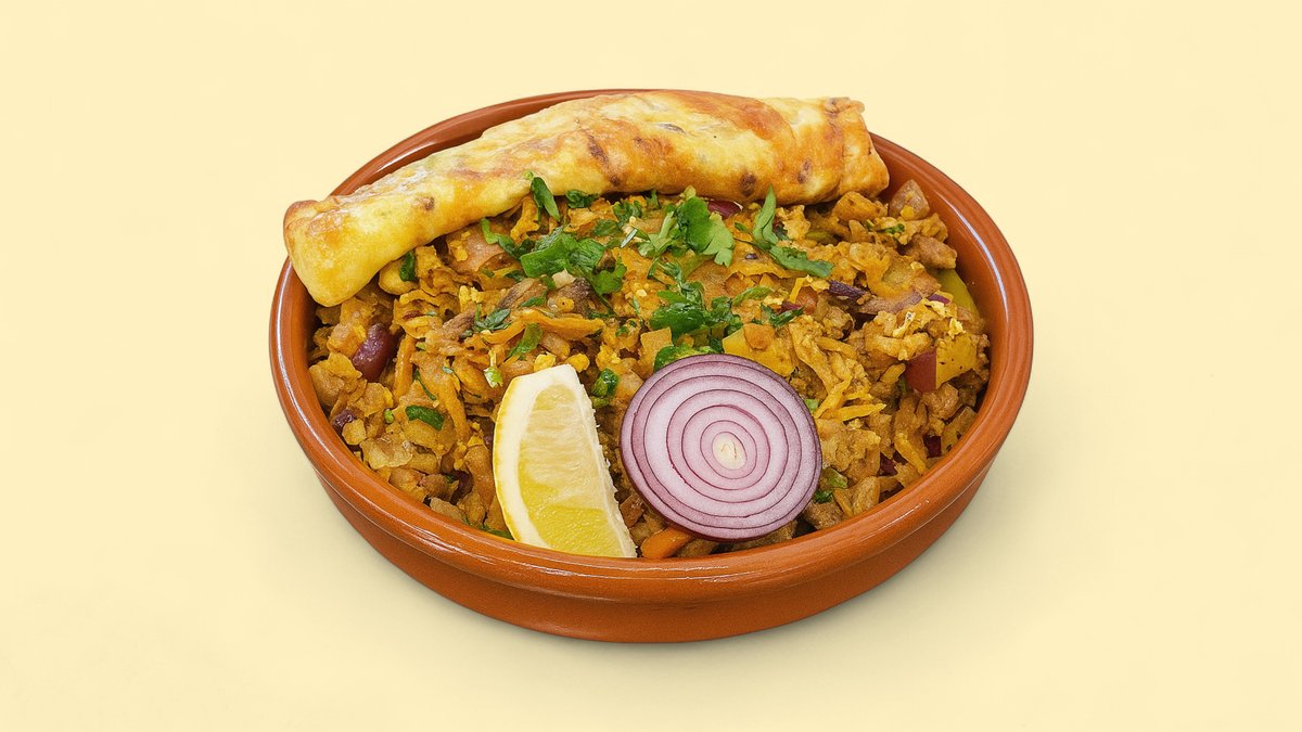 gehacktes Paratha-Fladenbrot mit Lamm-Curry, Lauch, Zwiebeln, Weißkohl und Ei