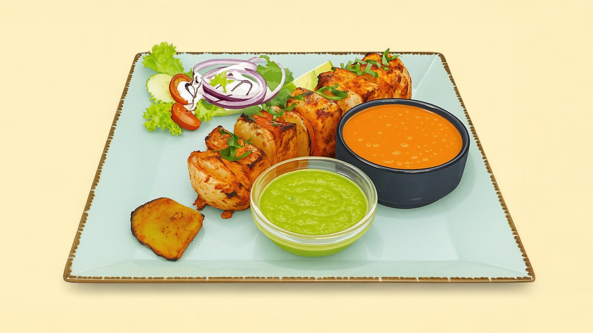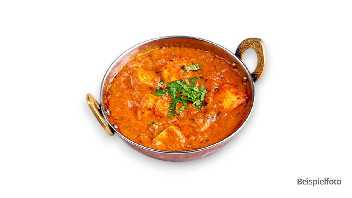 alle Gerichte werden mit einer Beilage deiner Wahl serviert („Paneer Tikka” wird ohne Beilage deiner Wahl serviert)